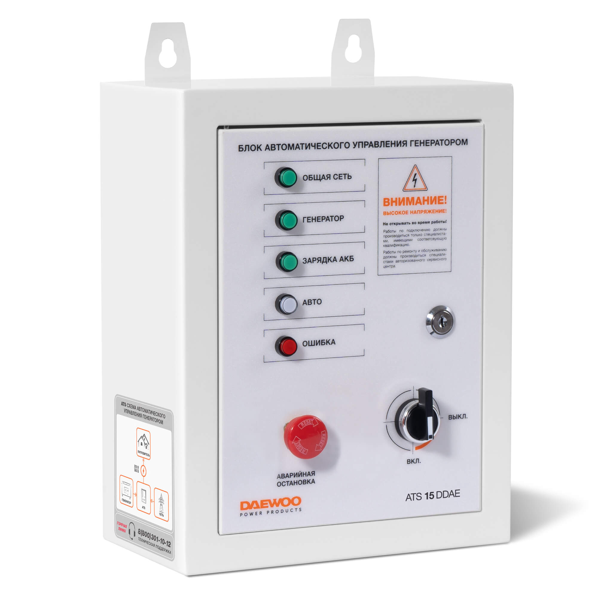 Блок автоматического управления DAEWOO ATS 15 DDAE обеспечивает автоматический запуск электростанции в случае падения напряжения в основной сети или прекращения подачи электроэнергии.